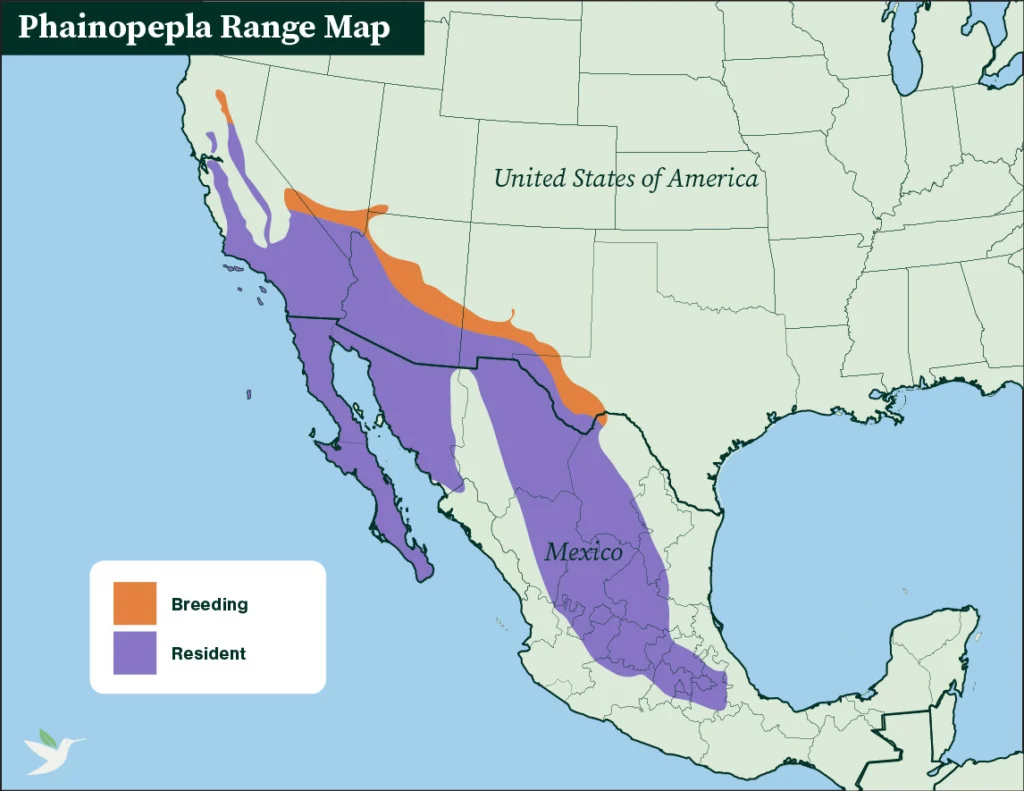During the fall, winter, and early spring, the Phainopepla is found in the dry Sonoran and Mojave Deserts in riparian areas and washes, particularly around trees and shrubs parasitized by desert mistletoe. Once the desert heats up in late spring and summer, this species moves to higher-elevation foothills and woodlands.