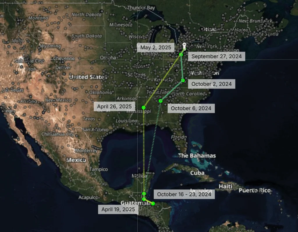 It’s unknown when he made it to Argentina, but in January and February 2025, he was near Mar Chiquita, a saline lake in the central part of the country. When the time came to migrate north, a Motus station in Guatemala picked up his signal on May 4; two days later, he passed Roma, Texas, in the Lower Rio Grande Valley. Later that month, a station north of Denver, Colorado, detected him, and on May 22, he arrived near where he started, at the Great Salt Lake Shorelands Preserve.