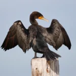 El cormorán orejudo, grande y negro, es un ave acuática común en lagos y costas de toda América del Norte.