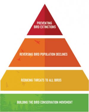 We take action across four main categories to conserve birds across the Americas. At the bottom of the pyramid, our efforts — such as building the capacity of partner organizations — benefit a large number of bird species.