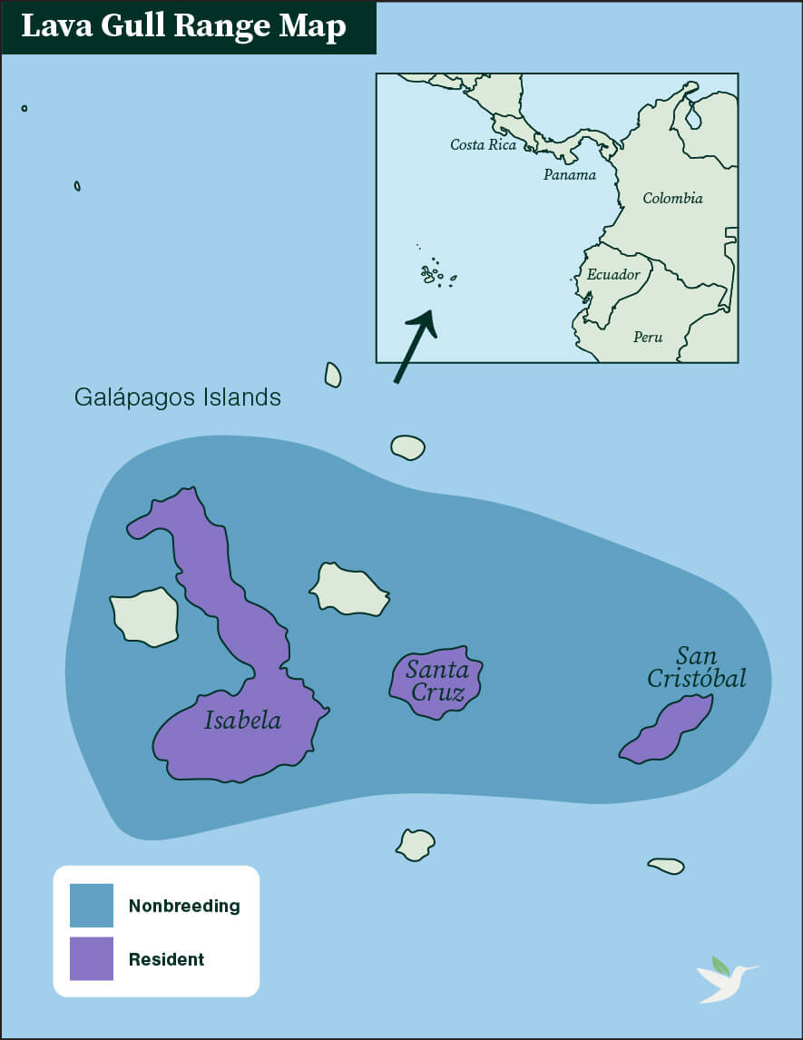 The Lava Gull is widespread (although not in large numbers) along the coastlines of Santa Cruz, San Cristóbal, Genovesa, and Isabela Islands in the Galápagos archipelago.