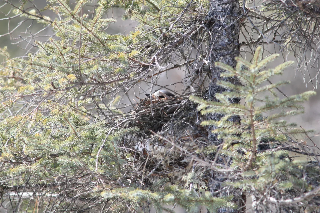 The male Canada Jay chooses a nest site, usually in a conifer, and begins the building process, with the female soon joining in. The nest is a bulky platform of spruce and tamarack twigs. The jays fill spaces in the outer nest layer with cocoons. The female jay finishes the nest with a soft, insulating layer of hair from deer and snowshoe hares. They tend to select nesting spots in the southern edges of their patch of forest, allowing them to take advantage of the sunlight.