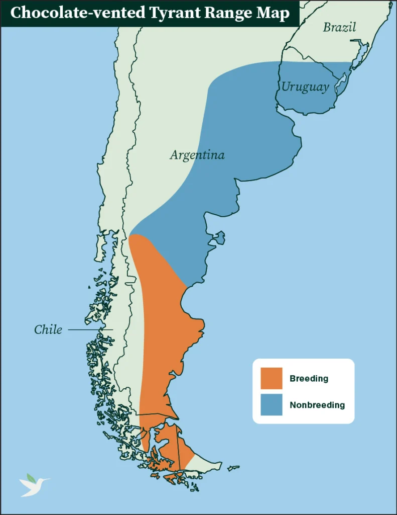 The Chocolate-vented Tyrant breeds in grassland and scrub on the Patagonian Steppe, from southeast Argentina to Tierra del Fuego. At the end of the Southern Hemisphere’s austral summer (from December through February), this species moves northward to the more temperate Pampas region of Argentina, Uruguay, and southeastern Brazil.