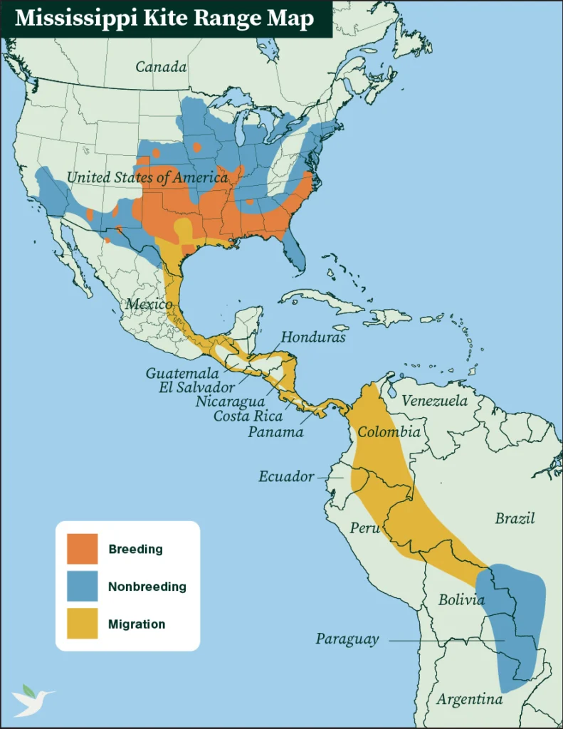 The Mississippi Kite migrates through Mexico and Central America to northern Argentina, southern Brazil, and Paraguay during the nonbreeding season. Human changes to the landscape, such as shelterbelts of trees planted in agricultural areas, have contributed to increased Mississippi Kite populations and range expansions.
