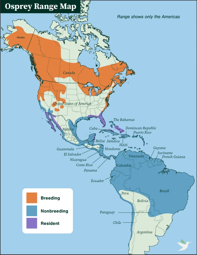 North American Osprey populations are migratory, with some individuals traveling long distances from the Gulf Coast states to as far south as South America for the nonbreeding season. There are year-round resident Ospreys in Florida, along the Gulf Coast, and in the Caribbean; these birds do not need to migrate because they have a year-round food supply.