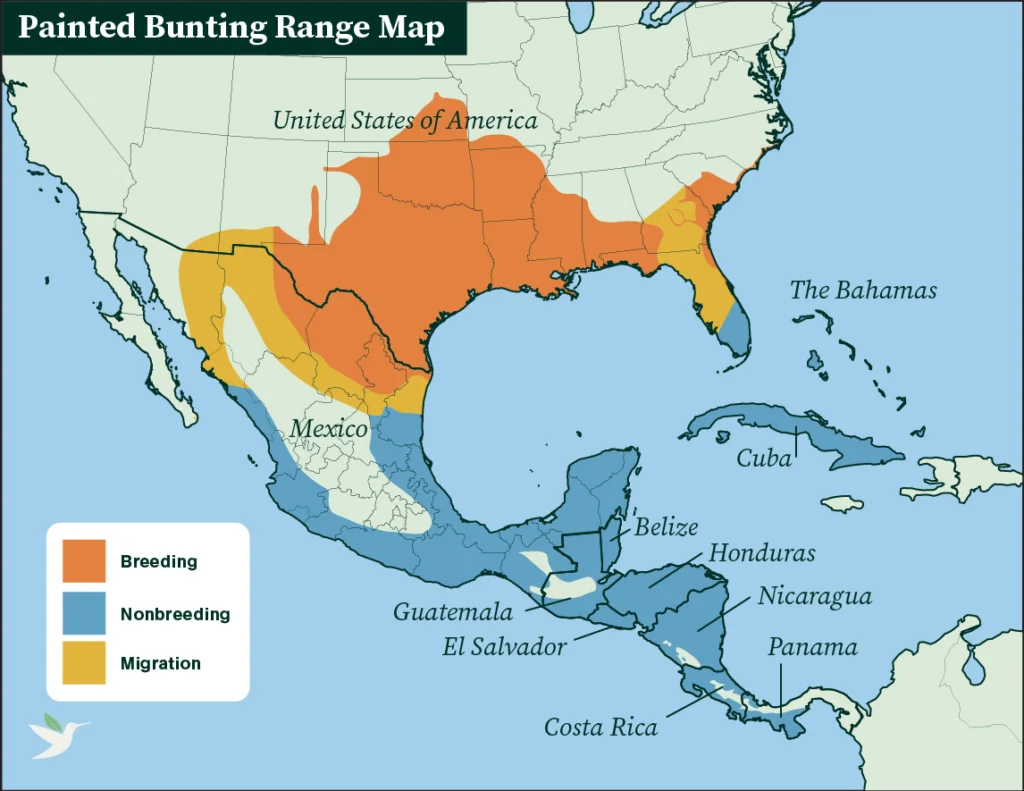 The Painted Bunting is unusual in that there are two separate populations that each breed and overwinter in different parts of the continent. The western or interior population breeds from western Florida to Texas and northern Mexico, while the eastern population breeds along the Atlantic Coast from Florida into North Carolina. A 2011 study found that these two populations are evolving independently, and may be on their way to becoming two separate species!