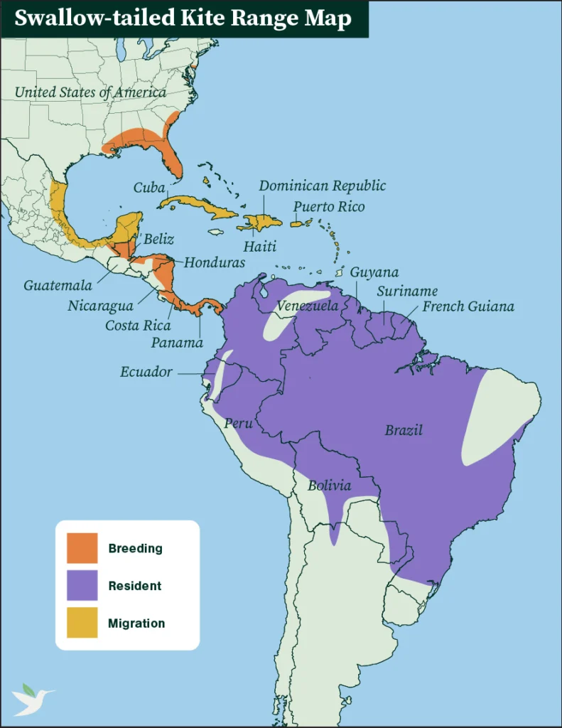 The Swallow-tailed Kite has two subspecies. One remains year-round in the humid lowland forests of South America as far south as southern Brazil and northern Argentina, but may migrate shorter distances. The other breeds in the southeastern U.S., from coastal South Carolina to Florida and west to Louisiana and Eastern Texas. This population migrates south for the nonbreeding season.
