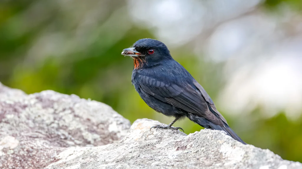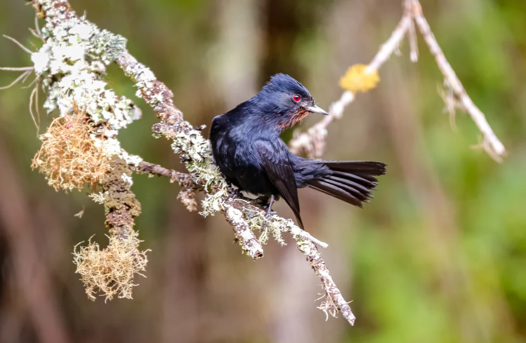 The sleek, Velvety Black-tyrant or maria-preta-de-garganta-vermelha in Portuguese, is found only in dry grasslands and forests of eastern Brazil, where its inky black plumage appears almost like a silhouette against the surrounding rocky, shrubby terrain. It shares these arid places with other rare endemics such as the Blue-eyed Ground-Dove, and the White-browed Antpitta.