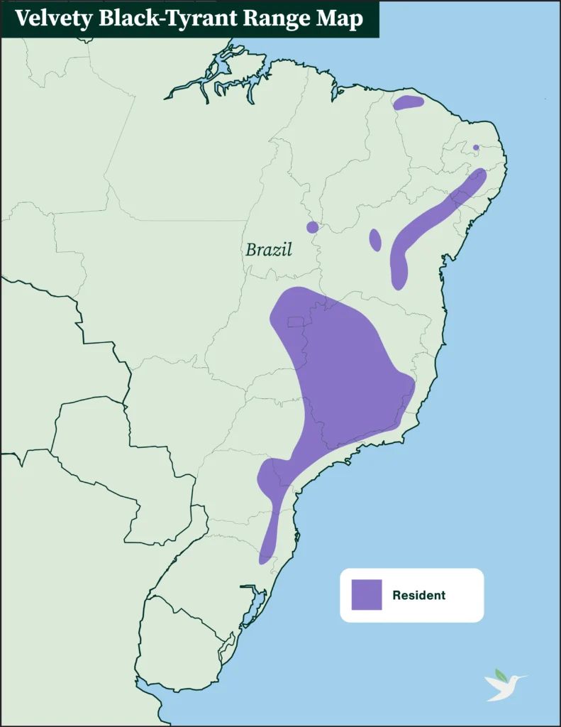 The Velvety Black-Tyrant is endemic to eastern Brazil, where it occurs in two separate populations in open grassy and rocky areas. One population can be found from the northeastern state of Pernambuco south to central Bahia, and the other is located further south, ranging from the state of Espírito Santo to Rio Grande do Sul.