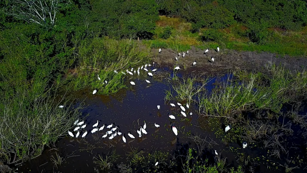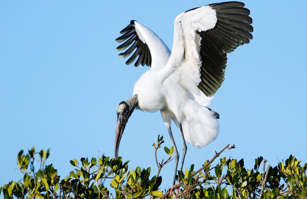 Wood Storks nest colonially, with up to 25 nests in one tree. Pairs often mate for life. In Florida, Wood Storks breed during the late winter dry season, when their fish prey are concentrated in shrinking pools. They regularly fly up to 12 miles from the nesting colony while foraging and will go much farther during droughts in search of food. Given their reliance on shallow bodies of standing water, Wood Storks are sensitive to changes in water levels brought on by water diversion projects.