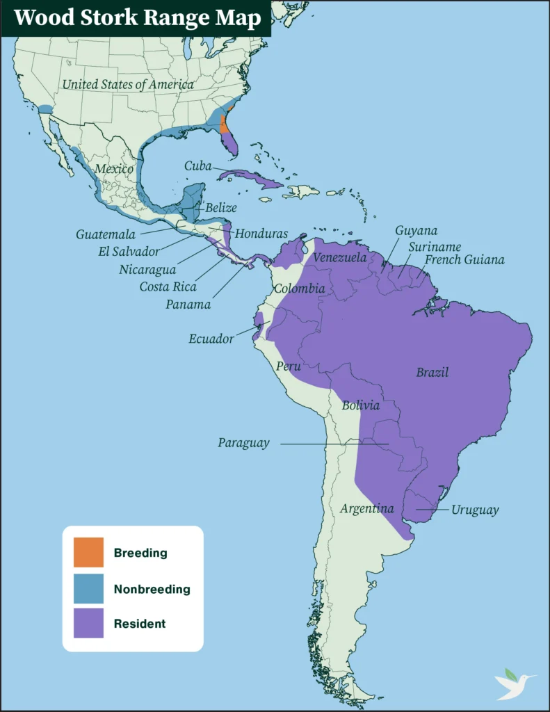 The Wood Stork is the only stork to breed in the United States, and the largest wading bird. They occupy a small range within the U.S., concentrated mostly along the coasts in the Southeast, with a year-round population in parts of Florida. A majority of Wood Storks are found outside of the U.S. along the coasts in Mexico and Central America, and throughout Cuba and much of South America.