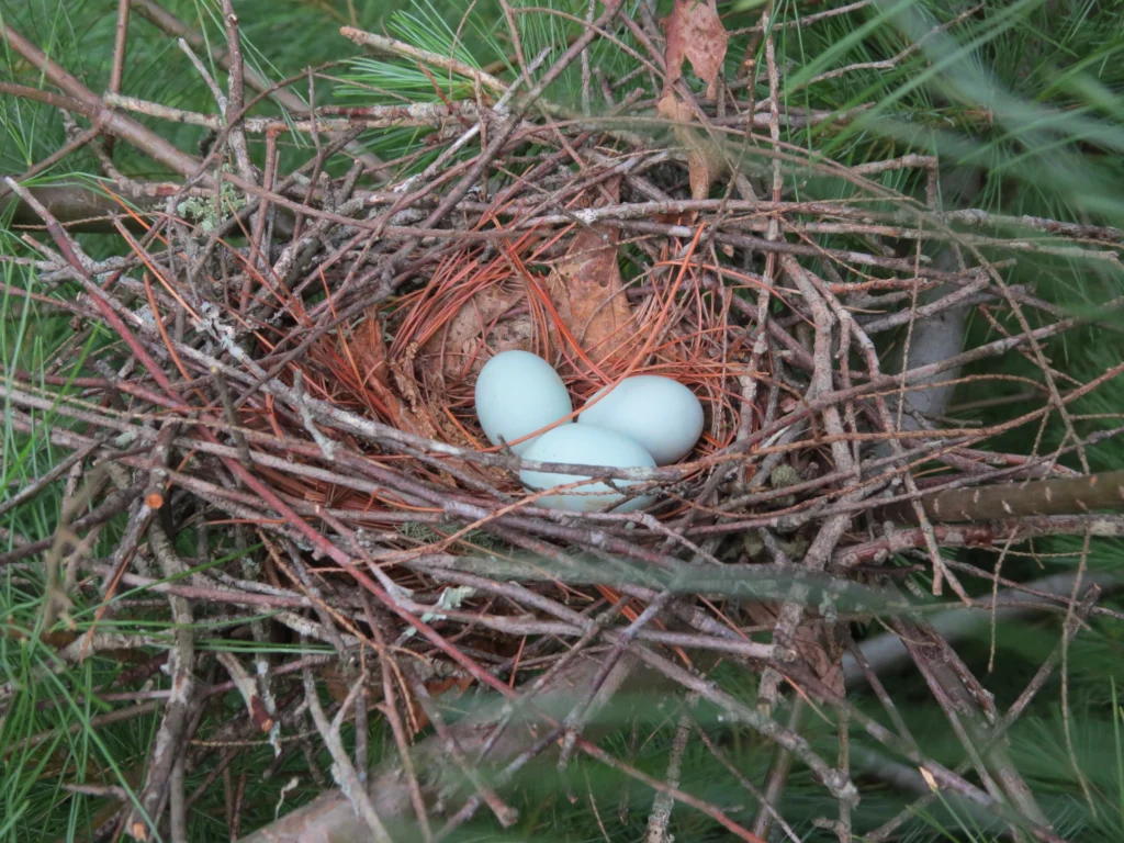 The female Yellow-billed Cuckoo lays a clutch of one to five pale bluish-green eggs (average clutch size is two to three eggs). Both male and female take turns incubating the clutch, and the eggs hatch after only nine days. The cuckoo chicks grow amazingly quickly, and are feathered and ready to fledge only about a week after hatching. This rapid turnaround time from egg to fledgling is among the shortest for any bird species. Although not wholly a brood parasite like its Eurasian cousins, the Yellow-billed Cuckoo will sometimes lay eggs in other birds’ nests.