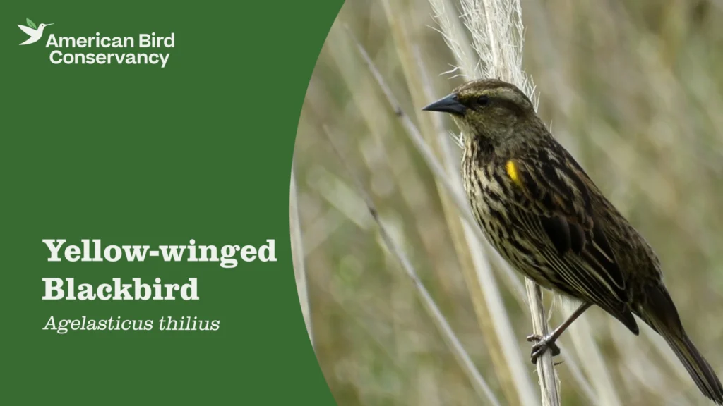 While the global population has not been formally assessed, the Yellow-winged Blackbird is fairly common across most of its range, and its populations are considered stable. However, this bird’s habitat requirements are quite specific, relying on marshes with emergent vegetation to breed, and threats to these marshes are threats to the Yellow-winged Blackbird, as well.