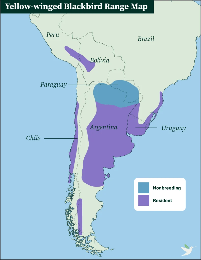 The Yellow-winged Blackbird has a wide range across the southern half of South America, living year-round in most of Uruguay, central Argentina, and southeastern Brazil. Some birds spend the nonbreeding season in northern Argentina and Paraguay. Separate populations inhabit the central coast of Chile, southern Patagonia, and the highlands of southern Peru and western Bolivia.