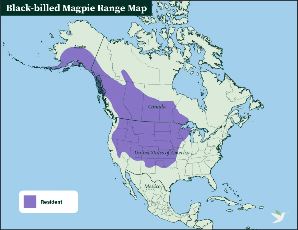 La urraca de pico negro habita en zonas abiertas y secas desde la península de Alaska y el sur de Alaska, al sur y al este de las Grandes Llanuras, las Montañas Rocosas y la zona norte del desierto del suroeste. Si bien las zonas ribereñas son importantes, esta especie suele evitar los bosques, excepto cuando se posa. Por ello, la tala de zonas boscosas para su asentamiento ha abierto nuevos hábitats para estas aves, especialmente en el bosque boreal canadiense.
