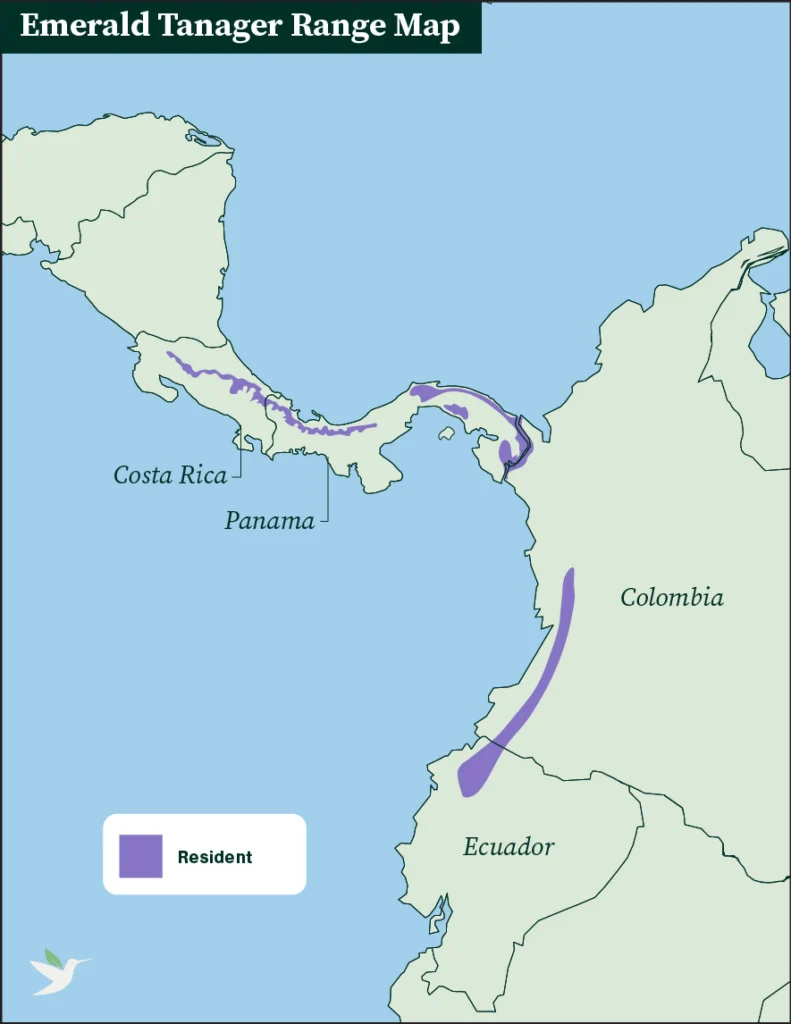 La distribución de la tangara esmeralda abarca la Cordillera Americana desde Costa Rica, pasando por Panamá, hasta Colombia. En Sudamérica, se la puede encontrar a lo largo de la Cordillera Occidental hasta Ecuador. Existen varias lagunas en la distribución de esta especie, que coinciden con las tierras bajas entre cordilleras adyacentes.