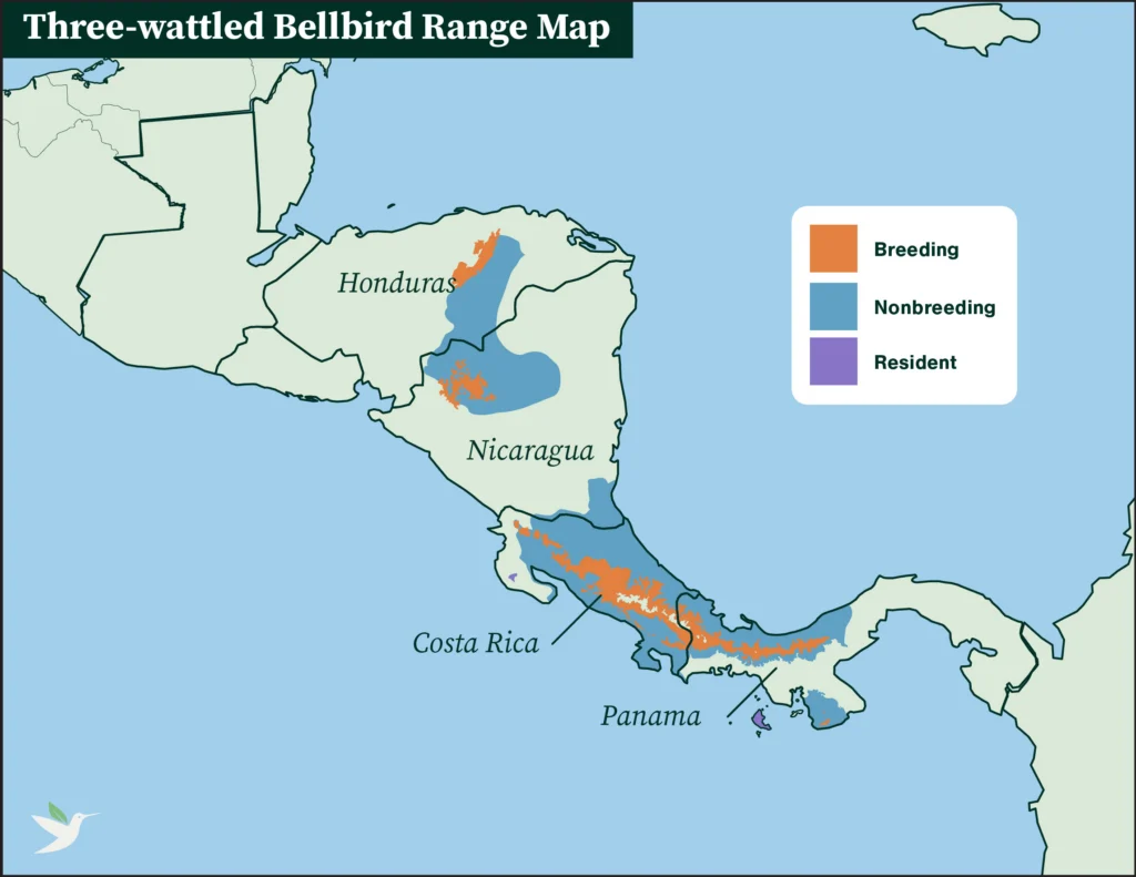 The Three-wattled Bellbird is known to breed in the mountain forests of Honduras, Nicaragua, Costa Rica, and Panama. These birds move both latitudinally and altitudinally after the breeding season, presumably following the availability of ripe fruit as they descend to the foothills and lowlands.