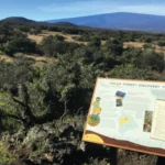 Directions: From Hilo, head west on State Route 200 (Saddle Road), passing Mauna Kea Observatory and Pōhakuloa Training Area, then bear right on the road to Waiki‘i. After going up a series of small hills, there will be a sharp right turn onto an uphill dirt road and a hunter check-in station. Stay on this road, R-1, as it climbs. The large parking lot for the Palila Forest Discovery Trail will be on the left side, approximately 3.8 miles from the paved road.