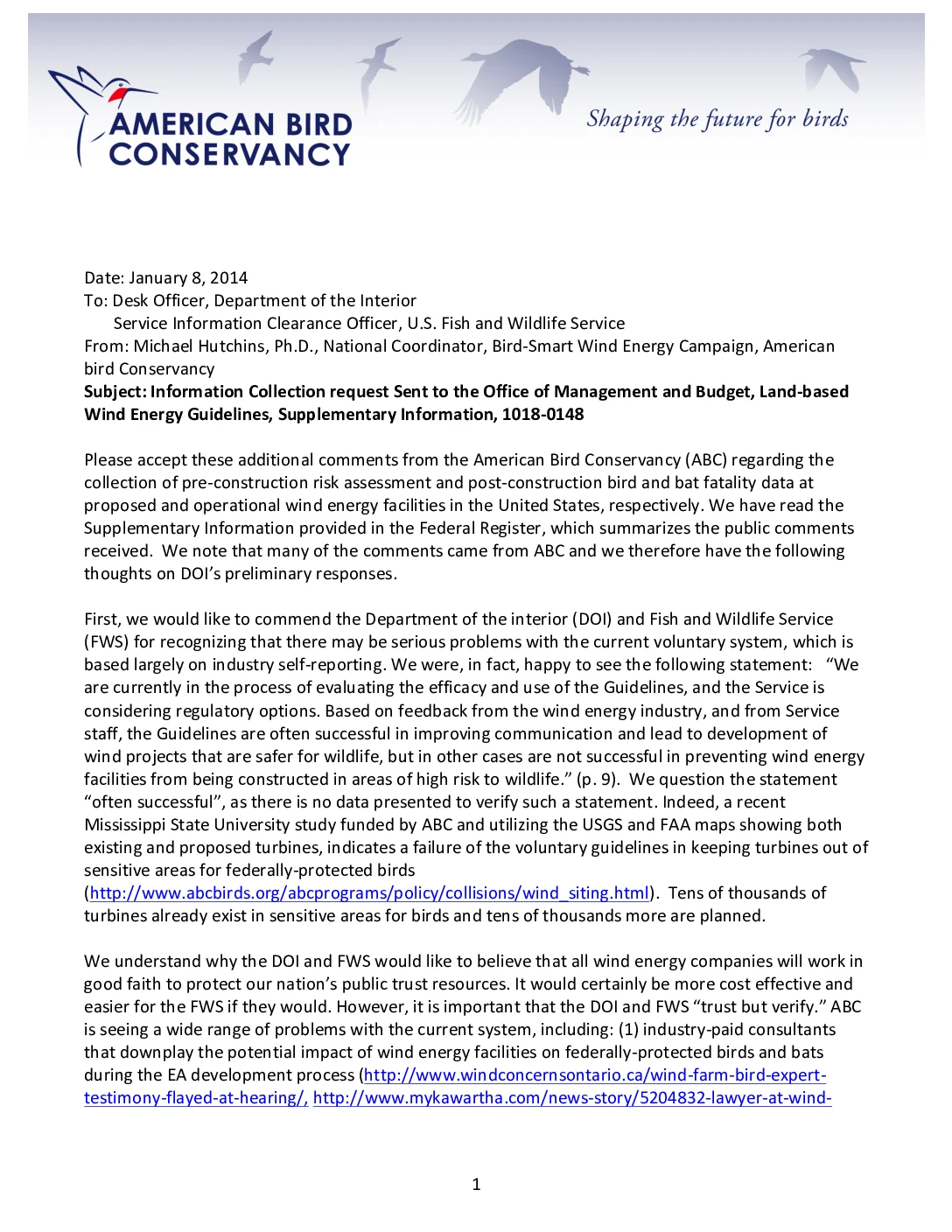 ABC sent DOI and its U.S. Fish and Wildlife Service (FWS) an April 30, 2014, Notice of Intent to Sue that cited DOI violations of the National Environmental Policy Act (NEPA), the Bald and Golden Eagle Protection Act (BGEPA), and other statutes in connection with the new eagle kill rule. ABC is being represented by the Washington, D.C. public interest law firm of Meyer Glitzenstein & Crystal.