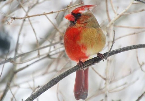 Although lacking the brilliant red plumage of the male, the female cardinal has an elegant beauty all her own, with a warm, buffy tan color over her back, breast, and sides; red-orange on the wings, tail, and crown; and a blackish “mask.” Female cardinals also have a crest and a chunky red-orange bill, traits they share with males.