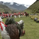 A group of locals, including a llama and dog, gather to plant tree saplings in the Vilcanota range of the Peruvian Andes. Image Credit: ECOAN